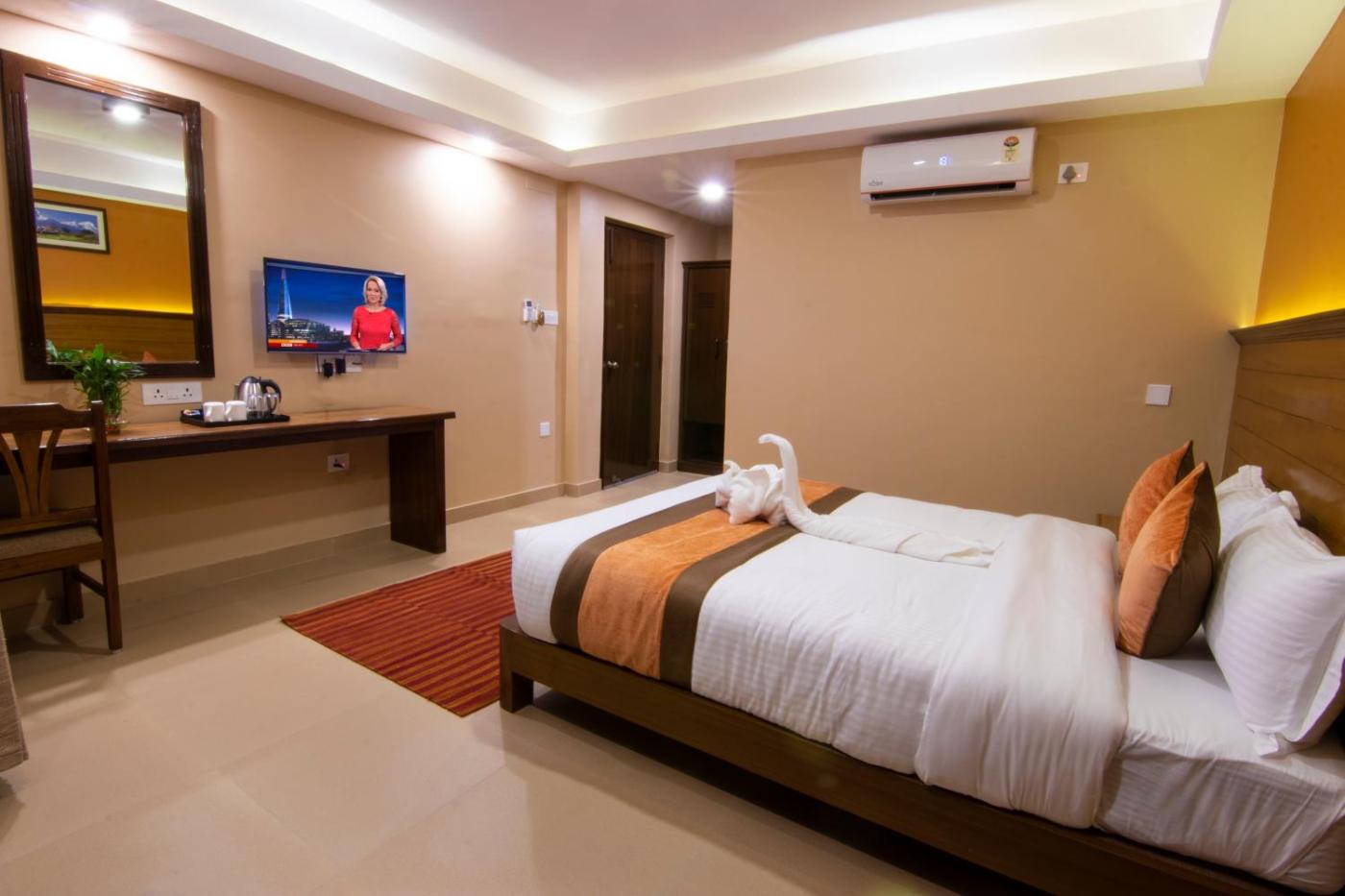 Deluxe Queen Room. The room faces either the city lake or mountain. The soundproof windows provided good sleep to our valuable clients.Our room is dedicated to guest comfort.the basic amenities such as colour LED T.V. with satellite channel 24 hours hot and cold showers, resting chair, dressing mirrors, fully air conditioned room make your stay luxurious. Also includes cooking appliances, oven and refrigerator. ;